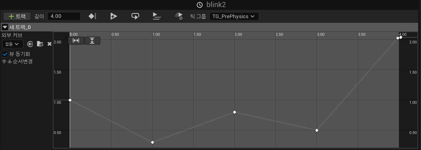 Create Dynamic Material Instance 노드를 사용하여 Post Process Material(M_Blink2)을 동적으로 관리할 수 있는 인스턴스를 생성하였습니다. Material Parameter Collection(M_Blink3)을 활용하여 머티리얼 내의 FadeAlpha 값을 제어하고 Timeline을 사용하여 FadeAlpha 값을 시간에 따라 점진적으로 변경하였습니다.
