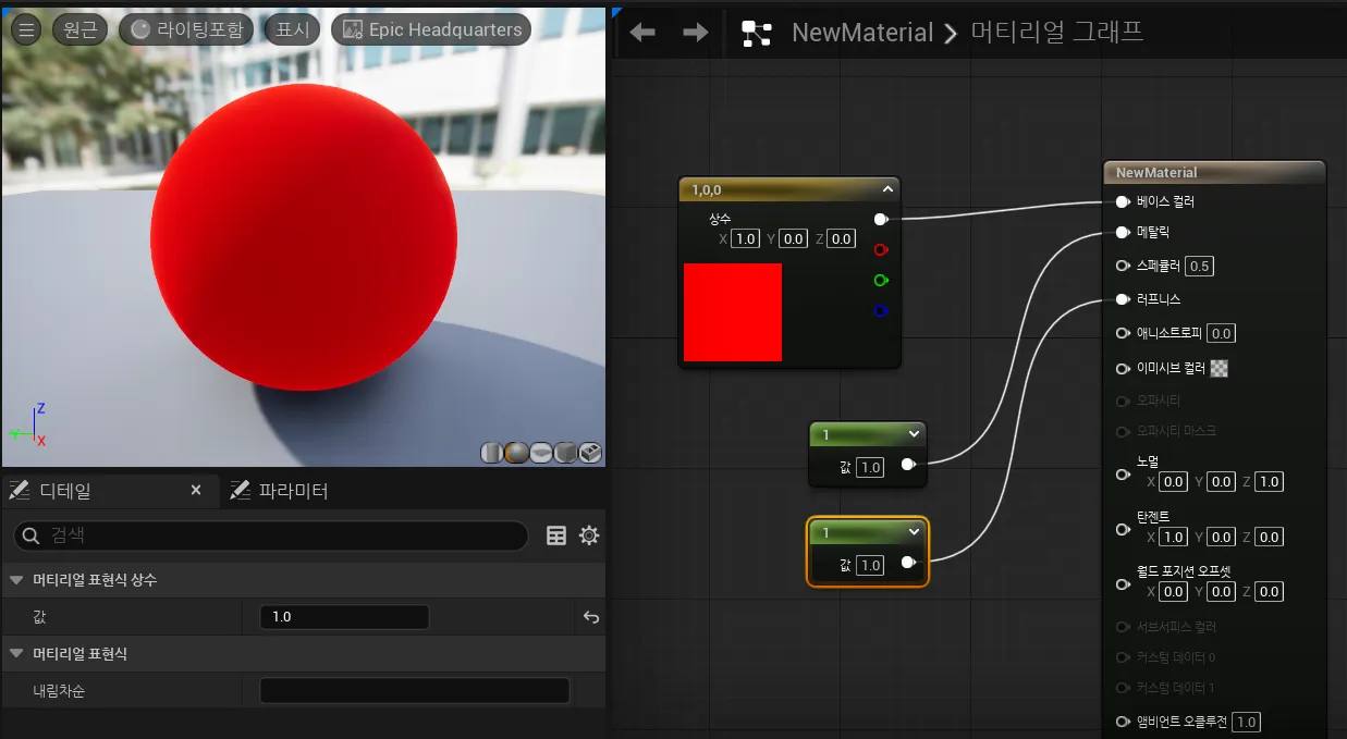 Constant3Vector을 베이스 컬러 프로퍼티에 연결하면 뷰포트의 구체가 빨간색으로 보입니다.