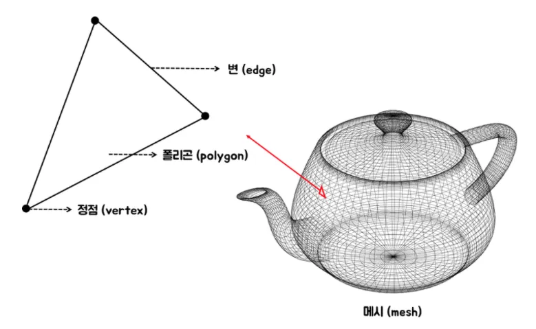 메시는 가상의 공간에서 하나의 객체를 시각적으로 표현하기 위한 개념으로, 점(Vertex), 선(Edge), 면(Face)으로 이루어진 집합체입니다. 단순히 형태를 이루는 정보만을 가지고 있어 표면의 재질을 표현하기 위해서는 머티리얼(Material)이 반드시 필요합니다. 머티리얼은 표면을 어떻게 보일 지를 결정하는 계산식이 담겨있습니다.