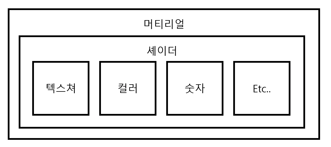 머티리얼은 위와 같은 구조로 이루어져 있습니다. 텍스쳐, 컬러, 숫자 등 여러 가지 형태로 이루어진 값인 파라미터를 셰이더의 필요한 프로퍼티들에 적용하고 물체가 빛을 받았을 때 어디가 밝아지고 어두워지는지 등을 셰이더의 계산식에 의해 결과물을 만들어 냅니다. 머티리얼은 셰이더와 셰이더에 적용할 파라미터를 묶어주는 역할을 합니다.