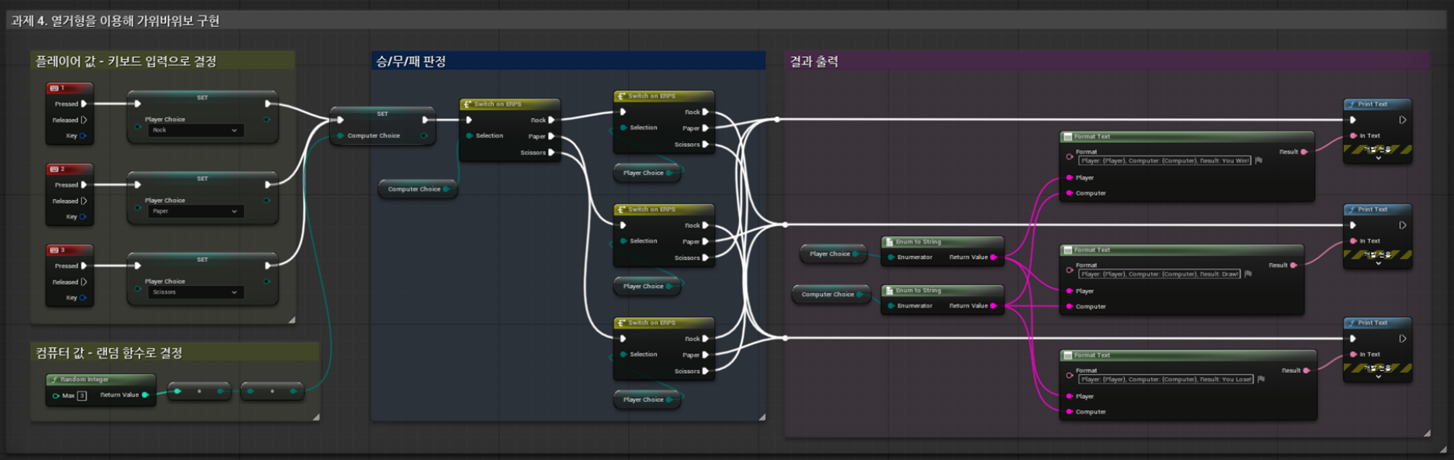 플레이어 값은 키보드 1, 2, 3 입력에 따라 PlayerChoice를 설정합니다. 컴퓨터 값은 Random Integer 노드를 사용해 0~2 사이의 랜덤 값을 생성해 결정합니다.