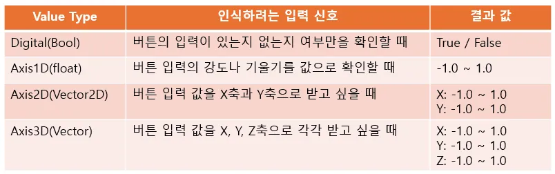 Input Action의 Value Type은 입력받았을 때 결과로 받을 값의 자료형을 결정할 수 있습니다.