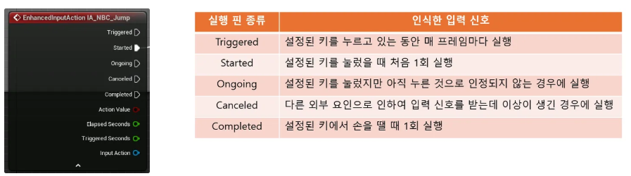 노드에는 사용자가 키를 누르는 동작에 따라 다양한 실행 핀이 존재합니다. 입력 이벤트 노드의 각각의 실행 핀 역할은 아래와 같습니다.