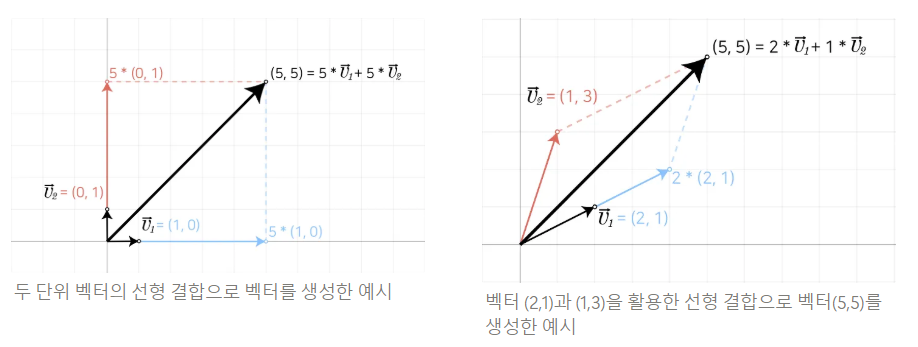 두 벡터가 선형 독립의 관계를 가진다면 선형 결합식으로 2차원 벡터 공간에 속한 모든 벡터를 생성할 수 있습니다.