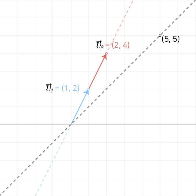 두 벡터 (1, 2)와 (2, 4)는 평행하지만 (5, 5)와는 서로 평행하지 않습니다. 두 벡터는 선형 종속의 관계를 가집니다.
