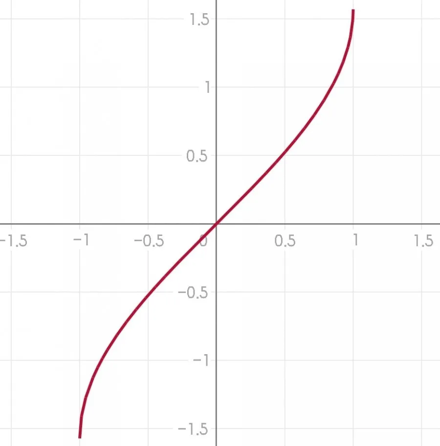 공역의 범위를 [-1, 1] 구간으로 한정하고 정의역의 범위를 좁혀 정의역의 한 요소가 공역의 한 요소에 대응되도록(정의역의 범위는 [-90˚, 90˚] 전단사함수를 만들면 역함수가 존재하게 됩니다.