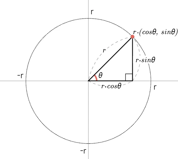 데카르트 좌표계로 회전을 구현하면 회전에 따른 x와 y의 변화를 매번 계산하는 번거로움이 발생합니다. 회전 동작을 기반으로 설계된 좌표계, 극좌표계(Polar coordinate system)를 사용한다면 편리하게 회전을 관리하고 구현할 수 있습니다. 이는 원점으로부터의 거리 r과 각 θ의 두 요소로 구성되며 극좌표계의 좌표는 (r, θ)로 표시합니다.