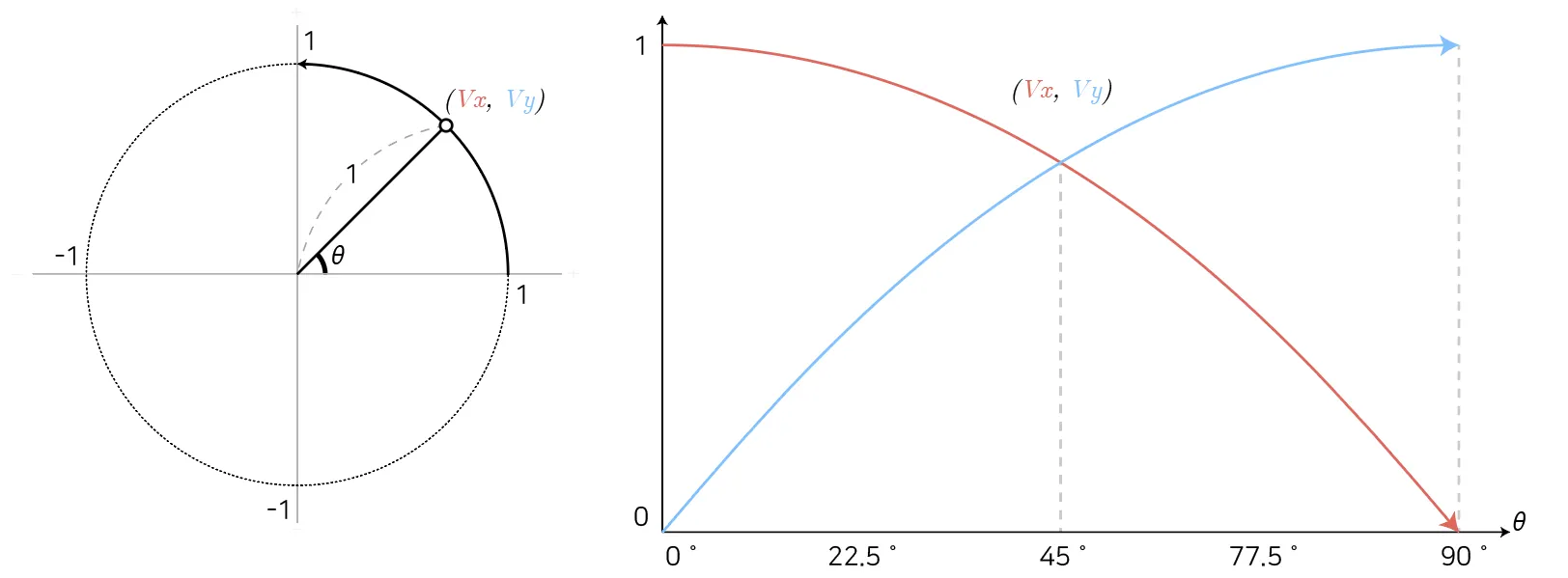 각도를 0도에서 90도까지 서서히 증가시키면서 회전하는 빗변의 좌표 Vx와 Vy의 변화를 살펴봅시다. 각도가 증가할수록 Vx값은 감소하고 Vy값은 증가합니다.