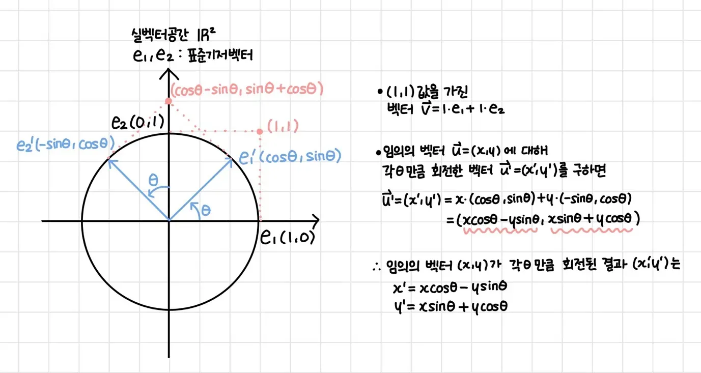 물체를 이동시키고 크기를 늘리는 동작은 x축과 y축이 서로 독립적으로 적용돼 따로 계산 후 결합한 것과 동일합니다. 하지만 회전은 x와 y값이 함께 영향을 미치기 때문에 독립적으로 계산할 수 없어 까다롭습니다.