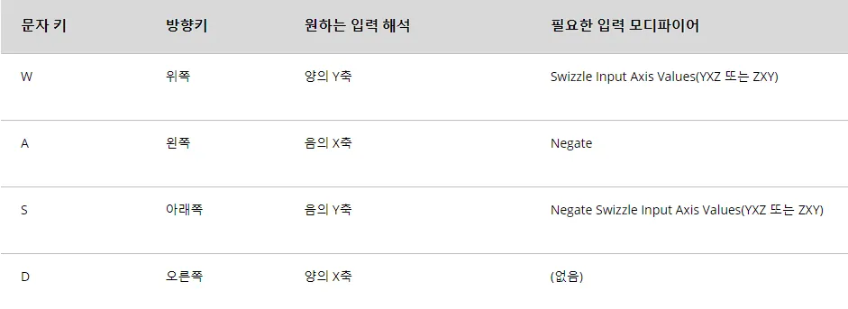이는 원래는 입력을 받으면 XYZ 의 순서로 받게 되는데(이 경우 Modifier 가 없다면 w를 누르면 X가 1이 된다) 이를 YXZ 의 순서로 받게 하여 W를 입력 시 Y가 1이 되도록 설정하는 것이다