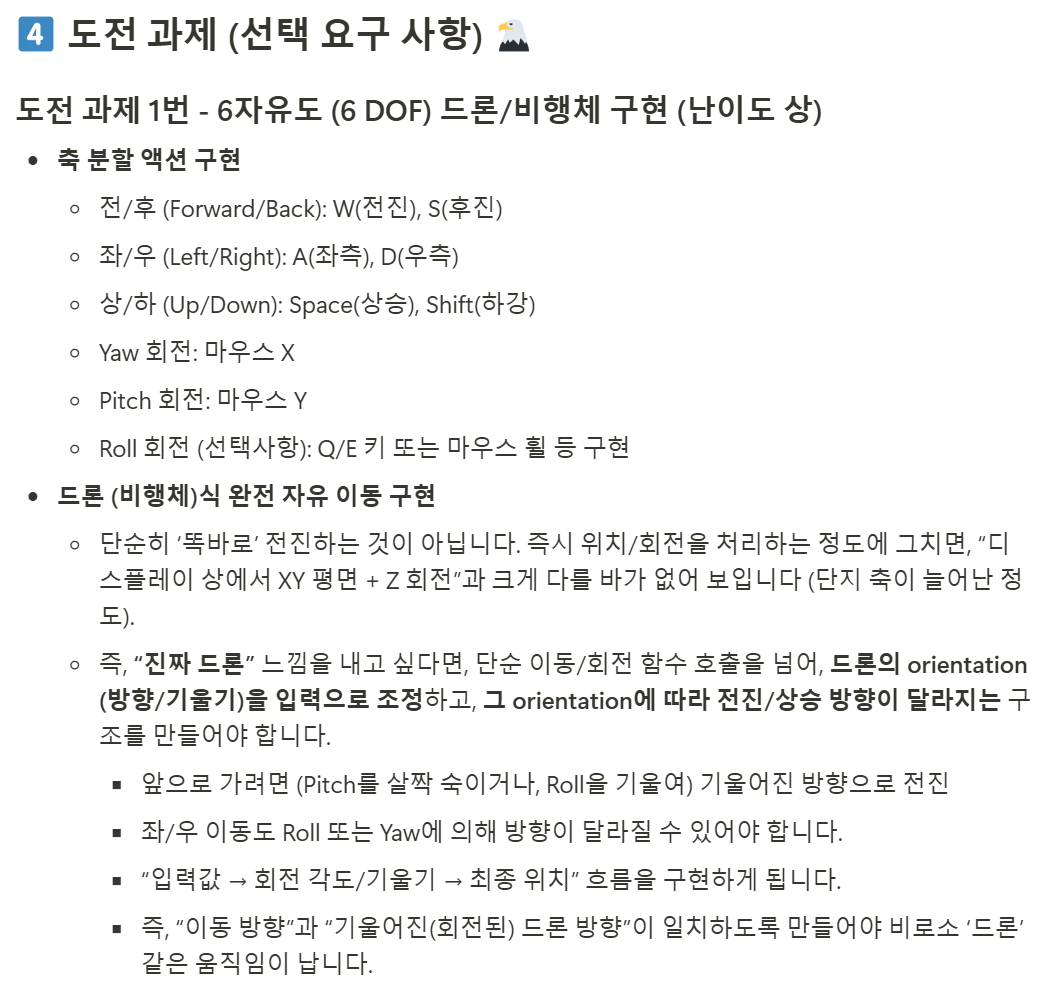 처음에는 Move / Look / UpDown / Roll 로 필수 과제에서 구현한 이동, 회전 함수에 추가로 상/하 이동 함수, Roll 회전 함수를 따로 만들었습니다. 구현하던 중 기존 xy에서 z를 추가로 구현한다는 사실을 깨닫고 상/하 이동을 Move 함수에, Roll 회전을 Look 함수에서 구현하도록 변경하였습니다. Input Action 또한 Axis2D에서 Axis3D로 변경했습니다.