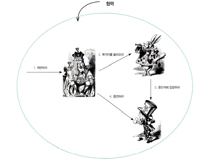 앨리스 이야기에서 중요한 것은 왕의 겉모습이 아니다. 왕이 중요한 이유는 재판이라는 협력에 ‘판사’의 역할로 참여해서 죄인의 죄를 판결하는 책임을 수행할 수 있기 때문이다.