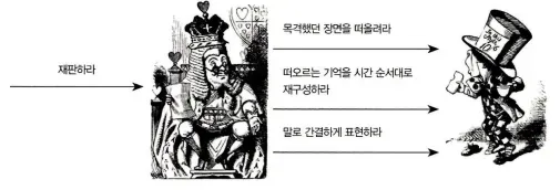 - 모자 장수에게는 목격했던 장면을 떠올리고, 떠오르는 기억을 시간 순서대로 재구성하고, 말로 간결하게 표현할 책임이 있다.