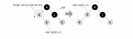 - 삼촌이 검은색이며 새로 삽입한 노드가 부모 노드의 왼쪽 자식인 경우