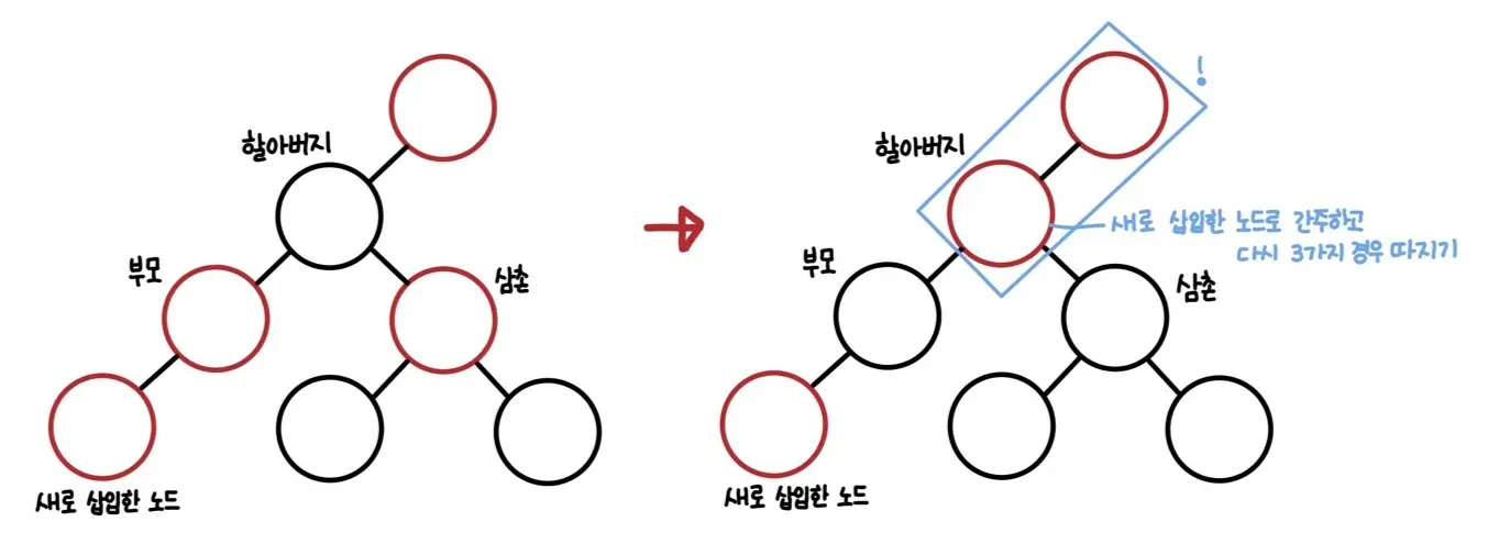 이 작업으로 인해 다시 규칙을 위반할 수 있으므로 할아버지 노드를 새로 삽입한 노드로 간주하고 다시 처음부터 규칙을 위반하는 3가지 경우를 따져봐야 합니다.