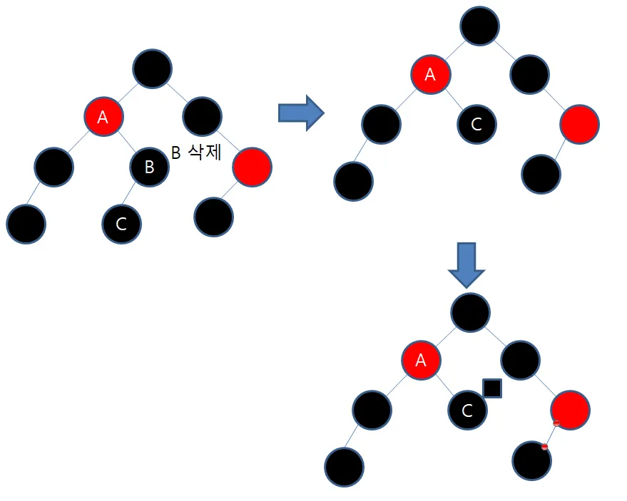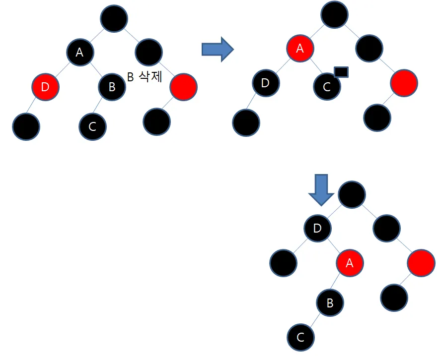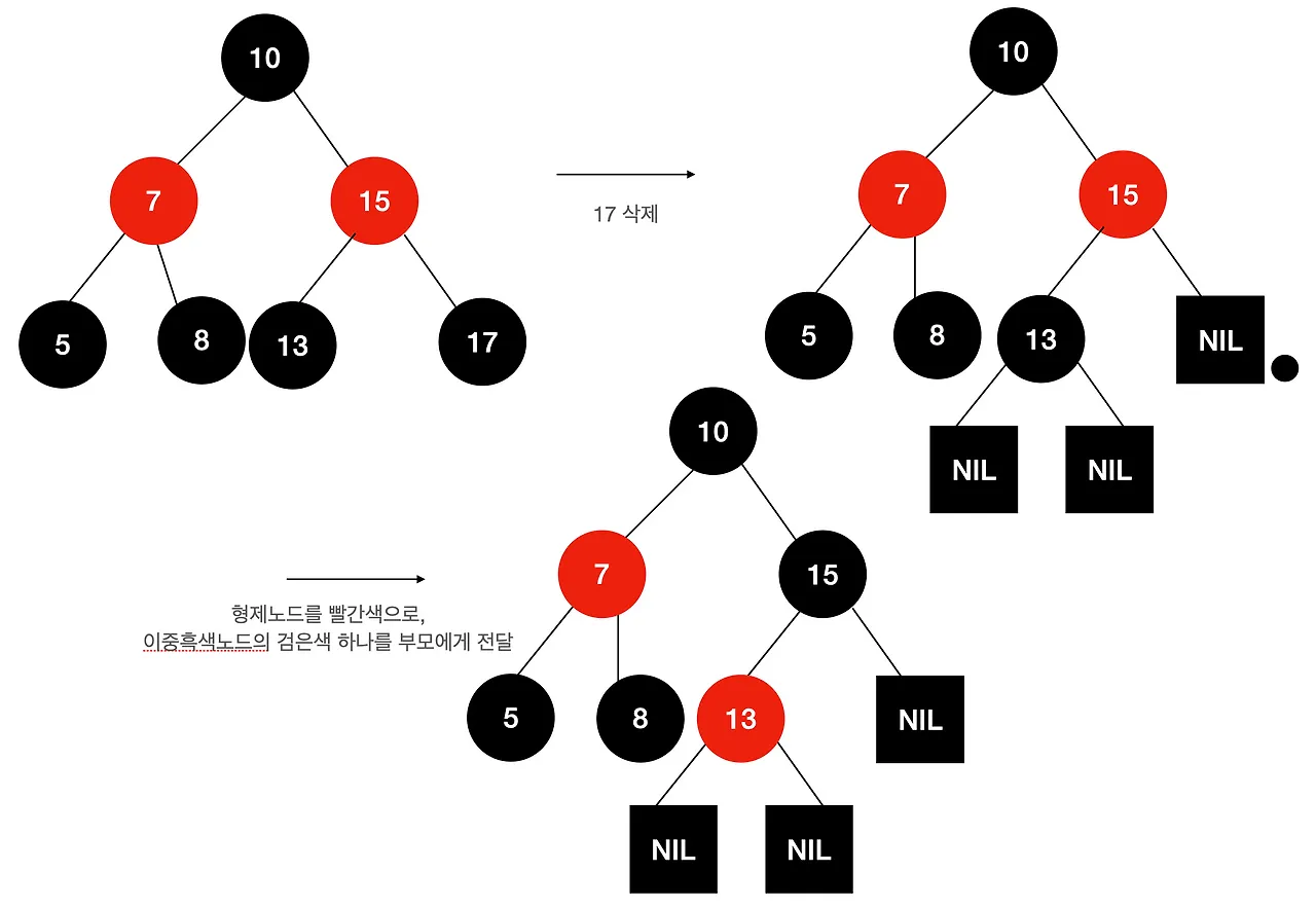 형제 노드만 빨간색으로 칠한 다음, 이중흑색 노드가 갖고 있던 두 개의 검은색 중 하나를 부모 노드에게 넘겨주면 됩니다. 그 뒤에 부모 노드의 검은색 노드 처리는 다시 4가지 경우에 따라 처리합니다.