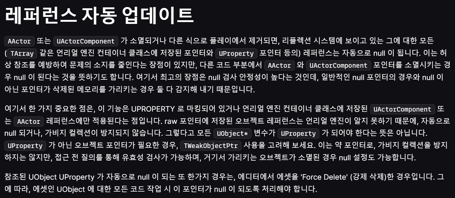 TWeakObjectPtr은 객체가 삭제되면 자동으로 nullptr로 변환되어 삭제된 객체를 참조하는 실수를 방지할 수 있습니다. 그러므로 위와 같이 코드를 수정하여 WeakParticle.IsValid()를 사용해 객체가 유효한 경우에만 DestroyComponent()를 실행하도록 변경하였습니다.