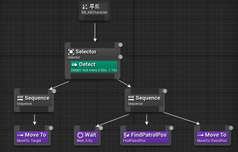 - 비헤이비어 트리 에디터에서 컴포짓에 Detect 서비스 부착