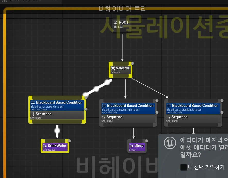 즉, DrinkWater Task 실행 → 애니메이션 시작 → 즉시 Succeeded 반환 → BT가 다시 실행이 되어 애니메이션의 앞부분만 계속해서 실행되는 문제가 발생했습니다.