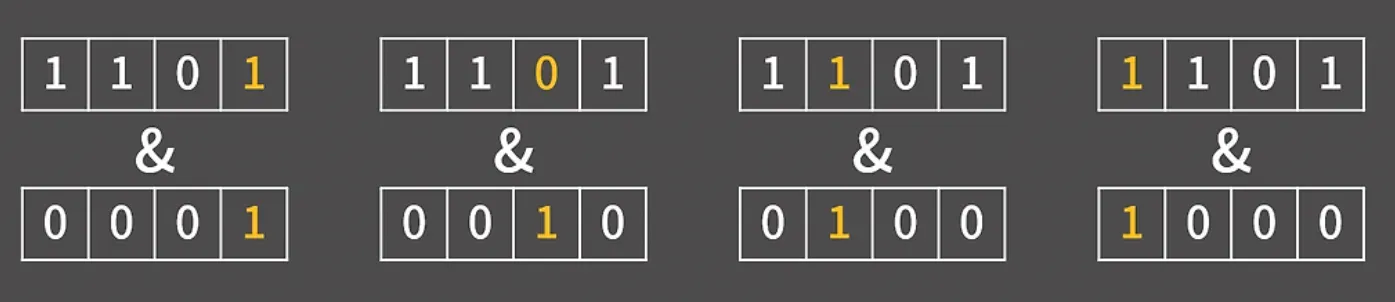 위 그림과 같이 0001, 0010, 0100, 1000과 AND 연산을 하면 각 비트가 0인지 1인지를 판단할 수 있다.