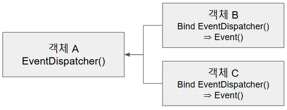 이벤트 디스패처(Event Dispatcher)는 A에게 등록된 이벤트 디스패처를 B와 C가 구독하고 있다가, A의 이벤트 디스패처가 호출(Call) 됐을 때, B와 C에게 바인딩 된 이벤트를 호출하므로 빠른 처리가 가능
