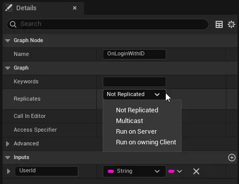 생성한 이벤트의 Replicates 속성을 Multicast, Run on Server , Run on owning Client로 설정하면, 바로 RPC가 된다.