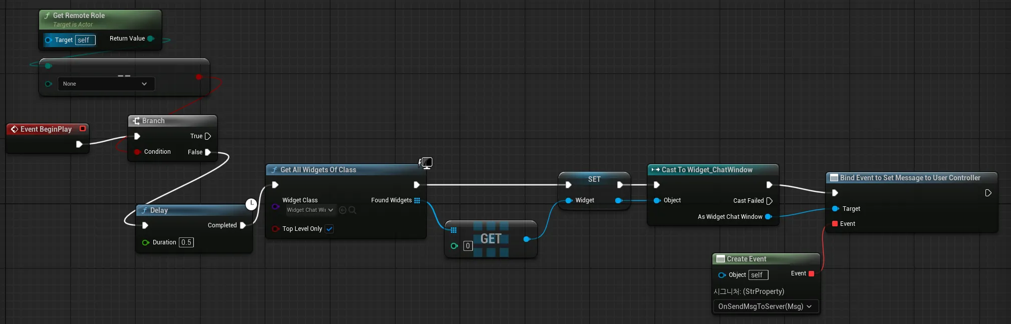Remote Role이 None이 아니라면 모든 Widget Class를 가져와서 Widget_ChatWindow Class로 변환하고, 변환이 성공적이라면 Widget_ChatWindow에서 특정 이벤트(OnSendMsgToServer)가 발생하면 Set Message to User Controller가 실행되도록 이벤트를 바인딩한다.