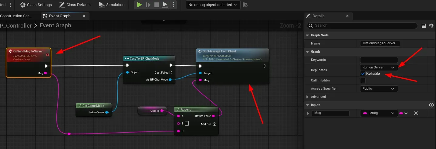GotMessageFromClient(Custom Event) 또한 서버에서 작동하도록 Run on Server, Reliable 체크