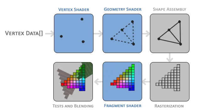- Vertex, Primitive를 처리하여 점, 선, 삼각형으로 구성하고, Rasterizer(하드웨어 가속기)에 전달