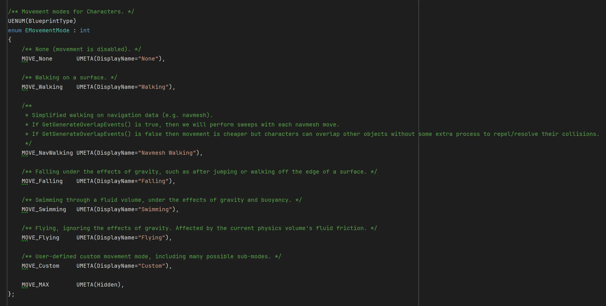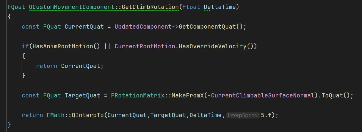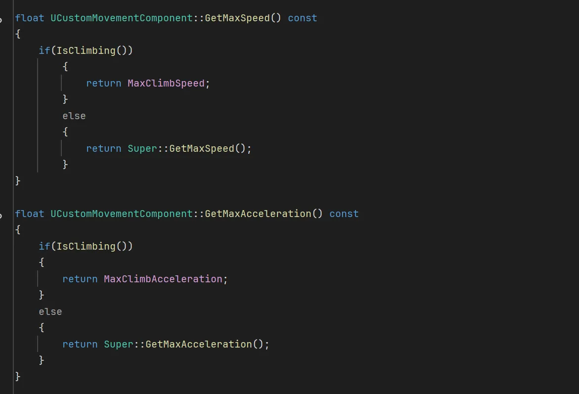 클라이밍 이동을 위해 CharacterMovementComponent 을 상속받은 CustomMovementComponent 에 구현했습니다. 또한 Movement Mode 에 MOVE_Custom 을 사용했습니다.