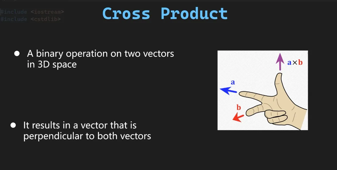 cross product(외적)는 3차원 벡터 공간에서 두 벡터로부터 새로운 벡터를 만들어내는 연산입니다. 두 벡터 a와 b의 교차 곱 a×b는 a와 b 모두에 수직인 벡터