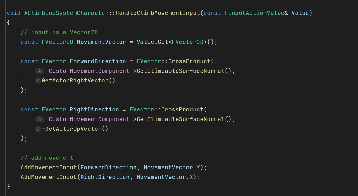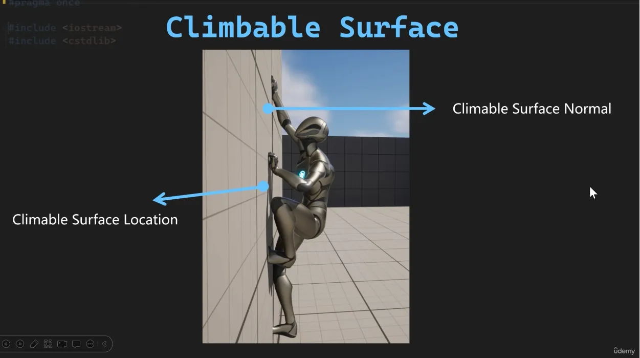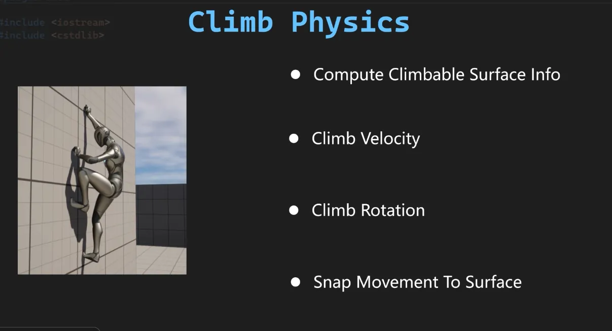 첫 번째 섹션에서는 클라이밍을 위한 이동을 어떻게 처리할 수 있는지 살펴보고, 기본적인 클라이밍 논리를 처리할 수 있도록 새로운 향상된 입력과 사용자 정의 이동 컴포넌트로 시작합니다. 그런 다음 다양한 트레이스를 사용하여 우리가 필요한 모든 클라이밍 가능한 표면 정보를 얻고, 캐릭터를 사용자 정의 이동 모드로 이동시키기 위해 필요한 물리학 코드를 처리하는 방법을 다룹니다. 물리학이 작동하면, 모든 클라이밍 가능한 표면 정보를 처리하고, 클라이밍을 위한 속도와 회전을 계산합니다.