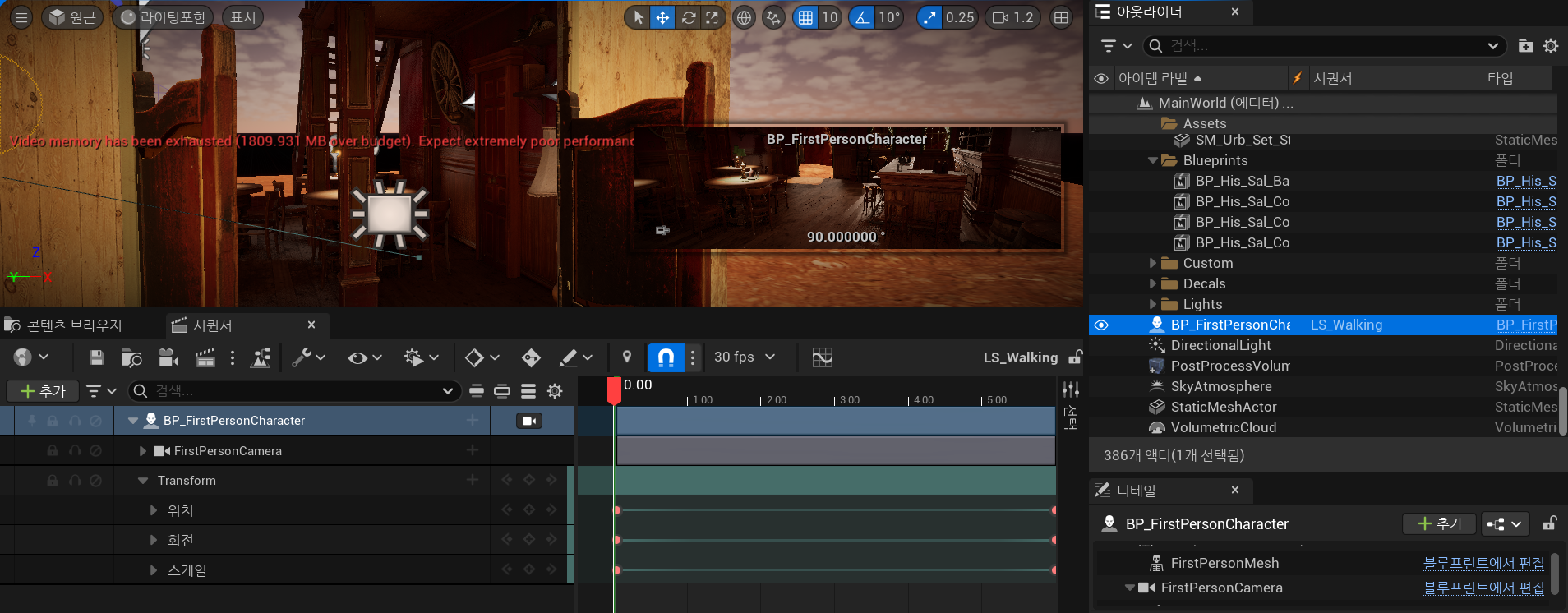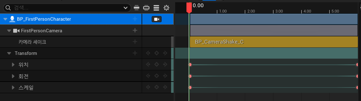공식 문서와 달랐던 내용은 제 프로젝트는 카메라가 캐릭터에 있다 보니 BP_FirstPersonCharacter을 가져오고 거기서 +를 클릭해 트랙을 가져오는 방식으로 했습니다. FirstPersonCamera, Transform을 추가했으며