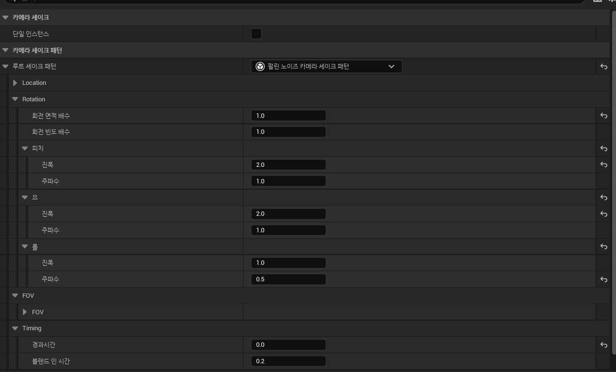 참고로 BP_CameraShake의 내용은 아래와 같이 설정했습니다