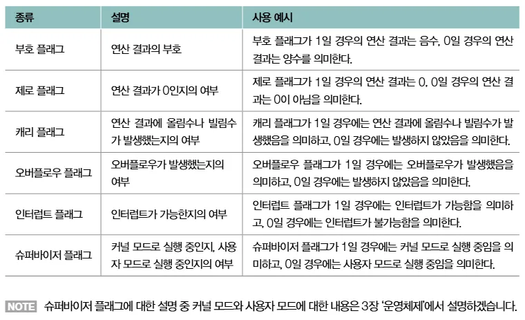 - 플래그 레지스터(flag register)는 연산의 결과 혹은 CPU 상태에 대한 부가 정보인 플래그(flag) 값을 저장