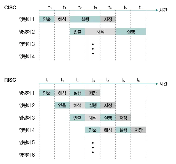 파이프라이닝 성능의 차이를 보이는 대표적인 명령어 집합 유형으로 CISC와 RISC가 있다