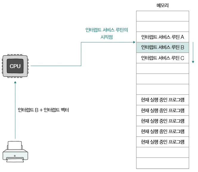 인터럽트 벡터는 인터럽트 서비스 루틴의 시작 주소를 포함하고 있기 때문에 CPU는 이를 이용해 특정 인터럽트 서비스 루틴을 실행할 수 있다