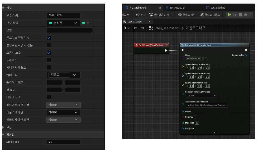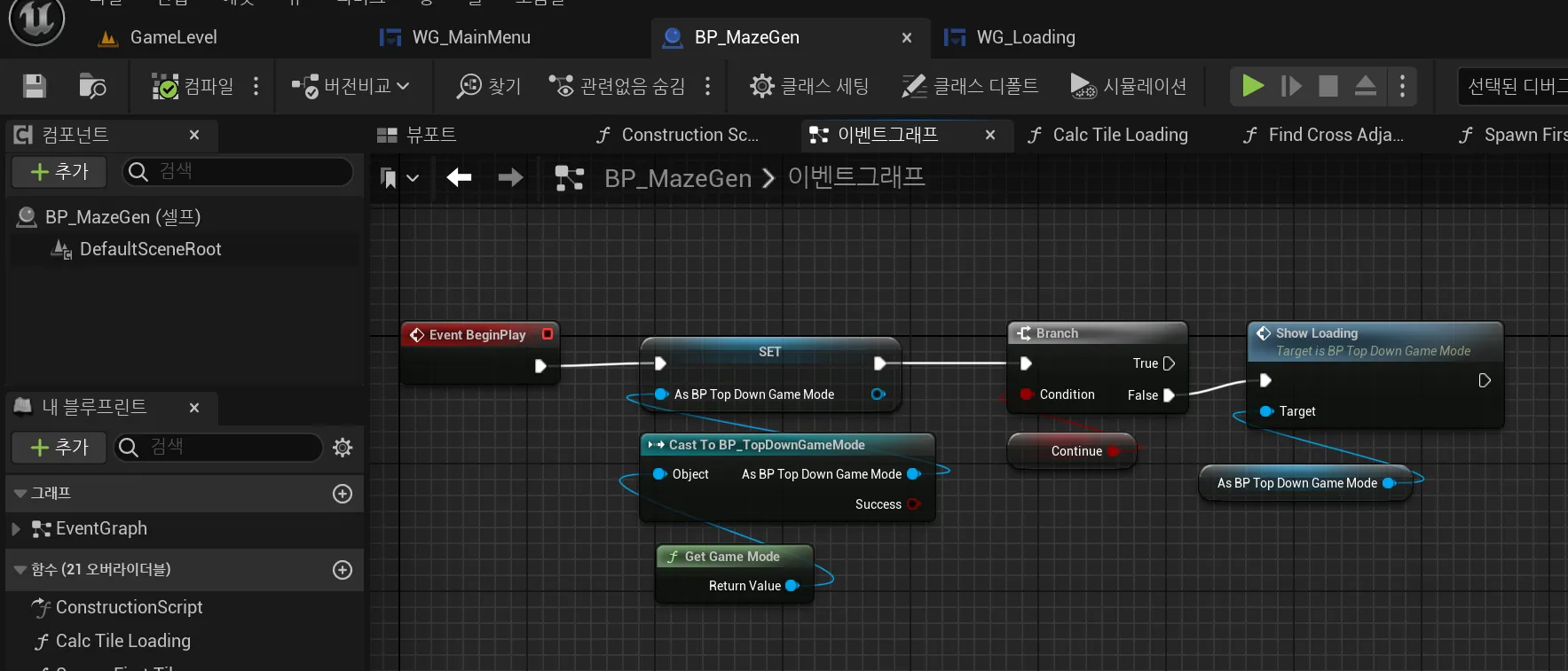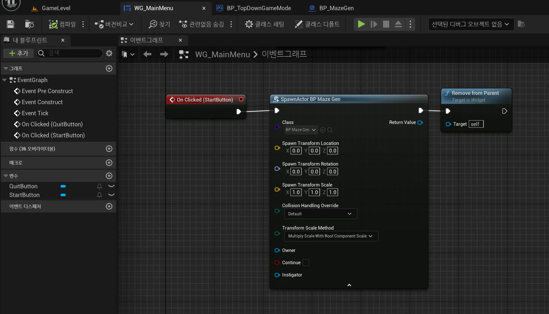 Start 버튼 클릭시 maze generation 생성. SpawnActor에 이제 Continue 값이 뜬다.