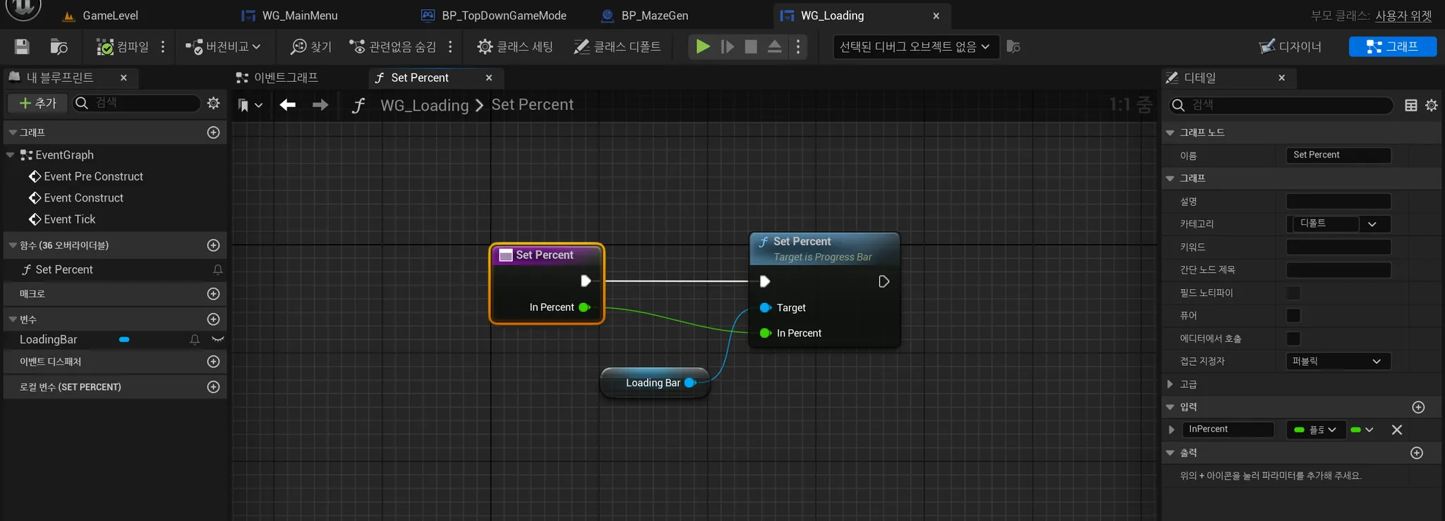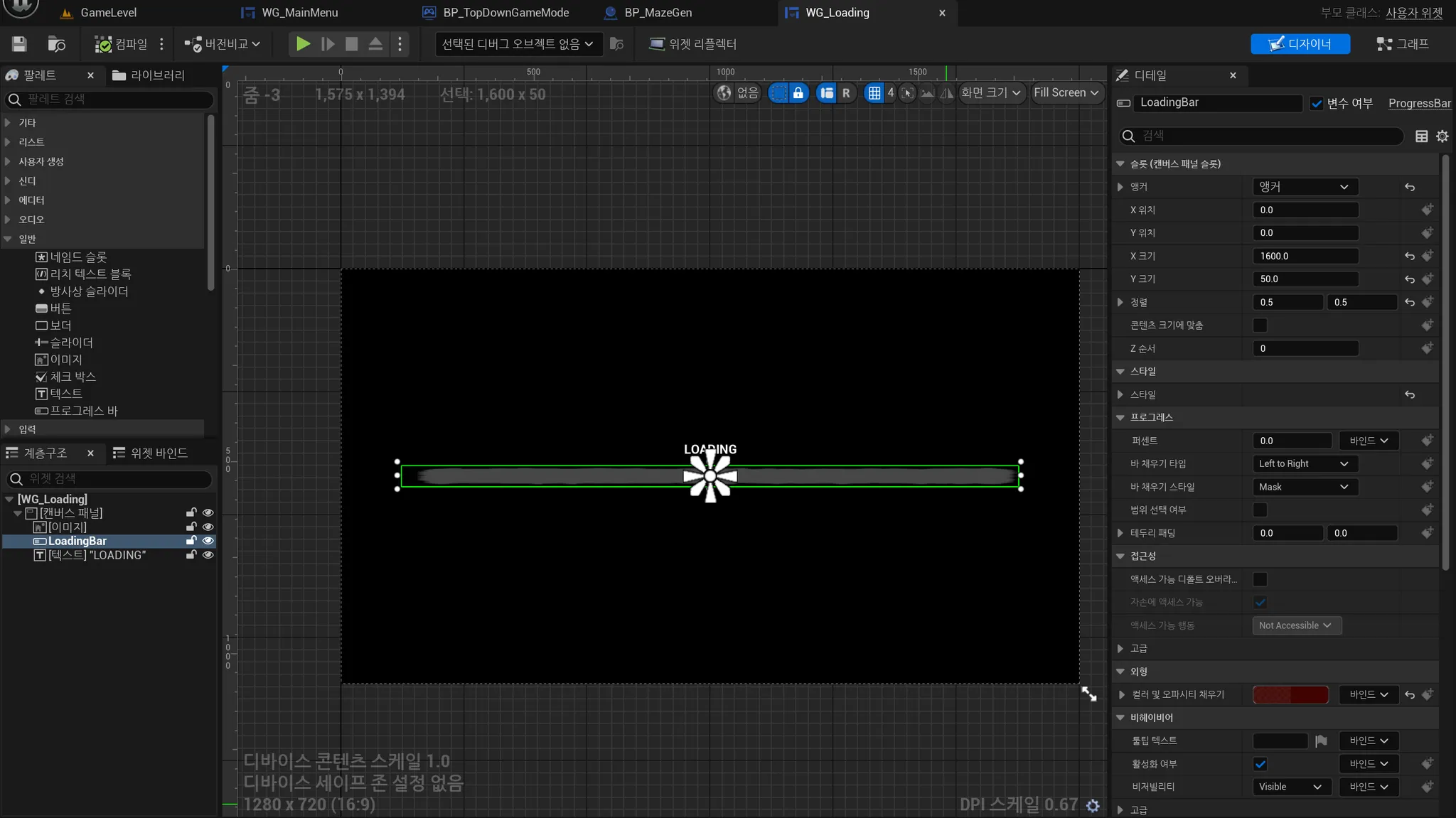 미로 생성 비율에 따라 로딩바를 채울 계획인데 1단계 타일 생성의 경우 로딩바의 40프로까지만 채워지도록 구현할 계획