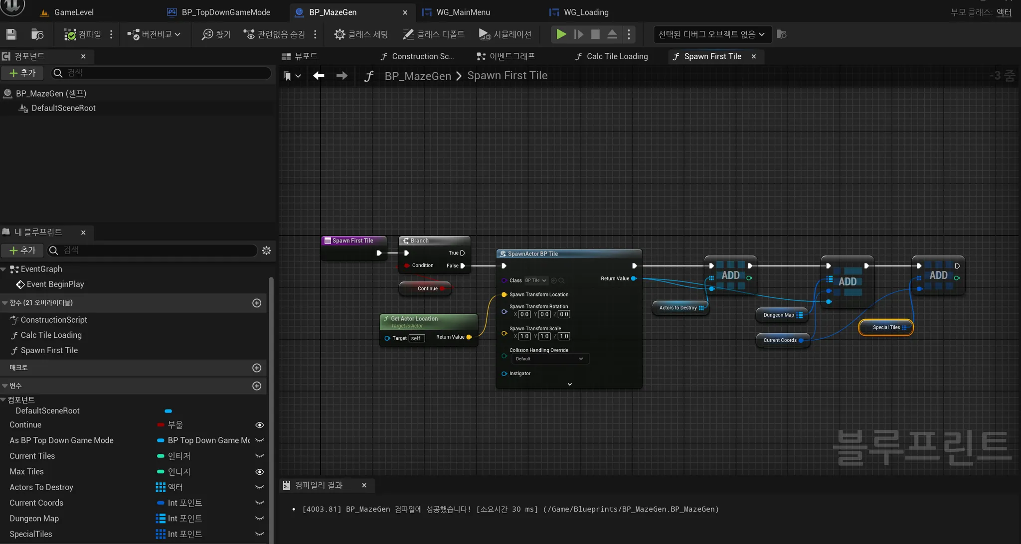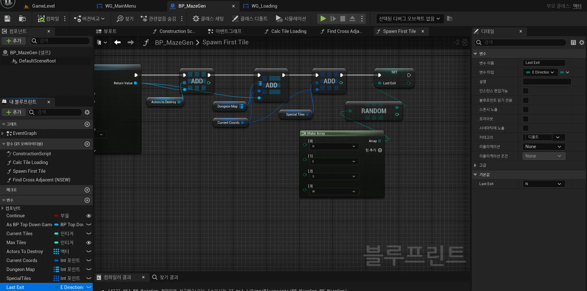 다음 미로를 생성할 때 이전 것을 삭제해서 RAM에 로드되지 않도록 최적화할 계획이라 Actors to Destory 배열 생성해서 추가. 그리고 Dungeon Map, Spectial Tiles에도 추가