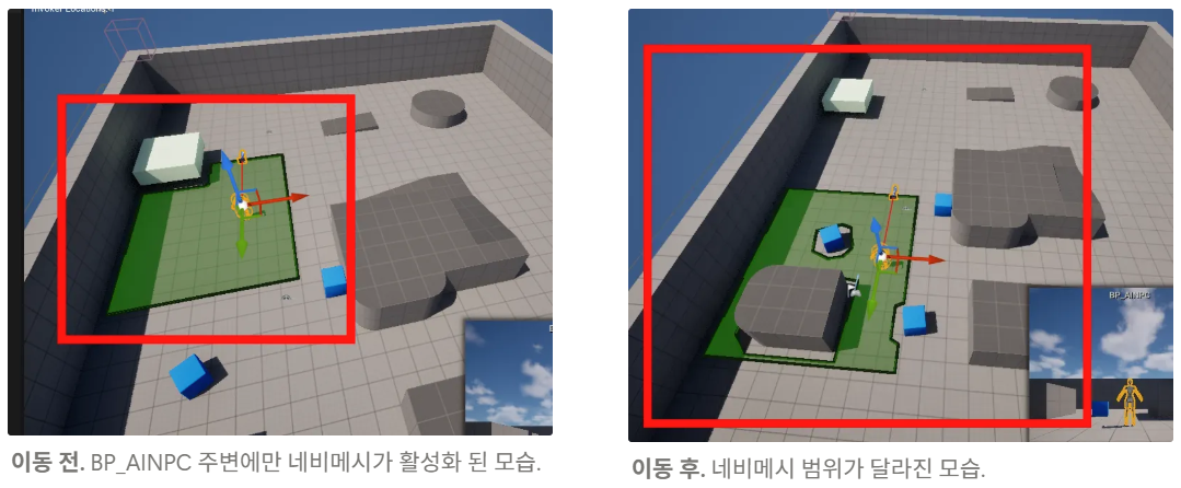 레벨 내 세팅 후 테스트 한 결과, 목표한 대로 BP_AINPC의 주변만 네비메시가 활성화 되는 모습이 확인된다.