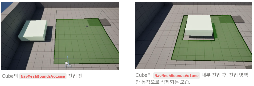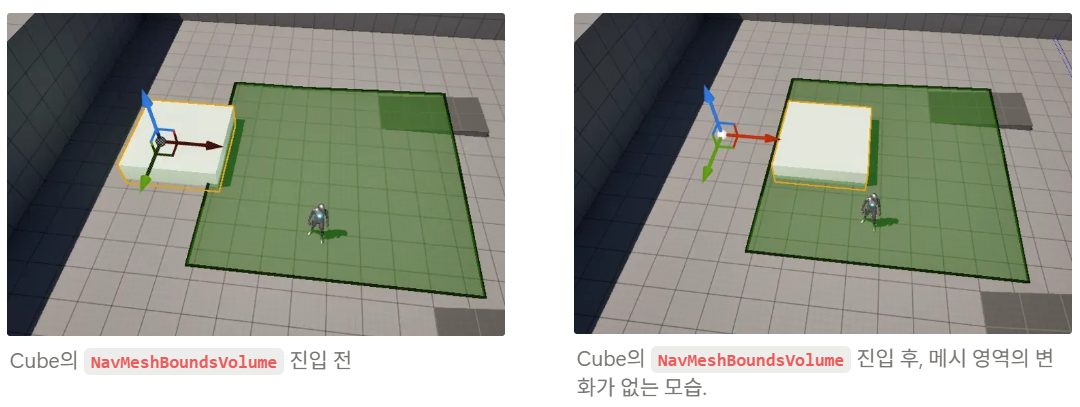 - NavMeshBoundsVolume은 아래와 같이 플레이 도중에 생긴 새로운 변화를 무시