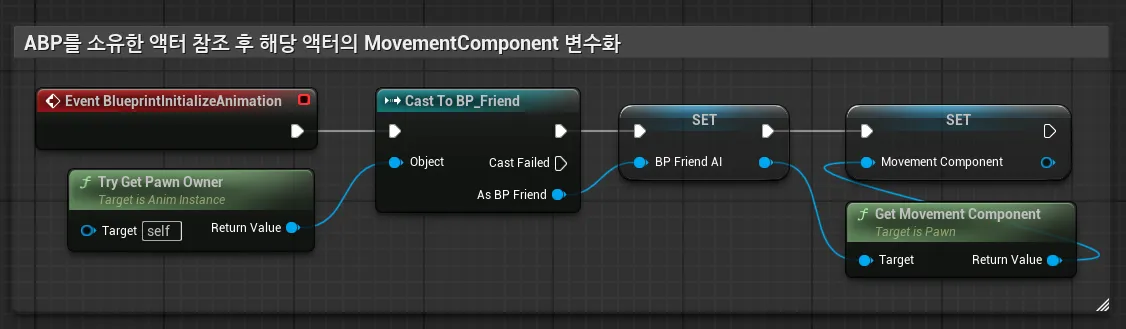 해당 로직은 해당 애니메이션 블루프린트를 사용하는 클라이언트 액터(BP_FriendAI)의 Movement Component를 추출하여 변수화한다.